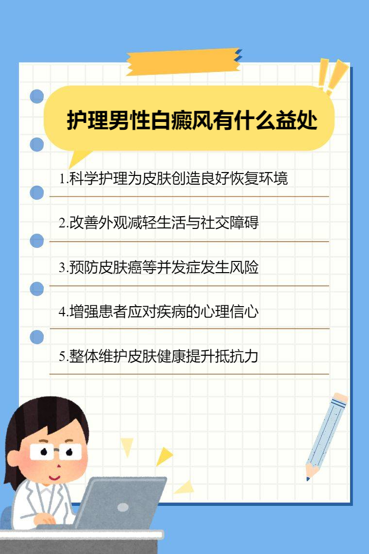 護理男性白癜風有益處體現在促進病情恢復、提升生活質量、預防併發症、增強心理調適、維護皮膚健康等。