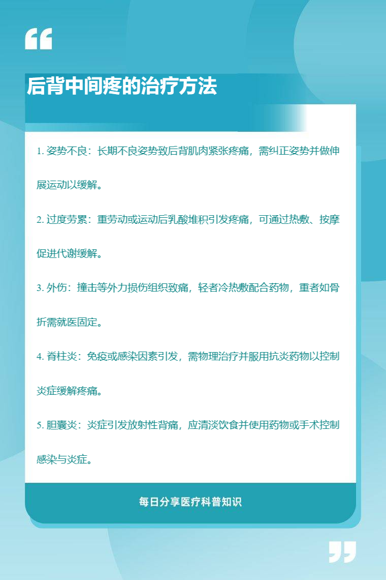 後背中間疼可能是姿勢不良、過度勞累、外傷、脊柱炎、膽囊炎等因素,需要針對病因治療,可採取的方法有物理治療、藥物治療等。