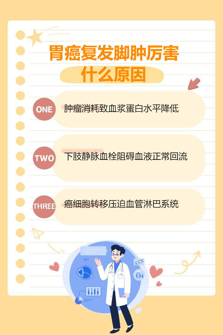 胃癌復發腳腫的厲害常見原因有低蛋白血症、下肢靜脈血栓、腫瘤轉移等。