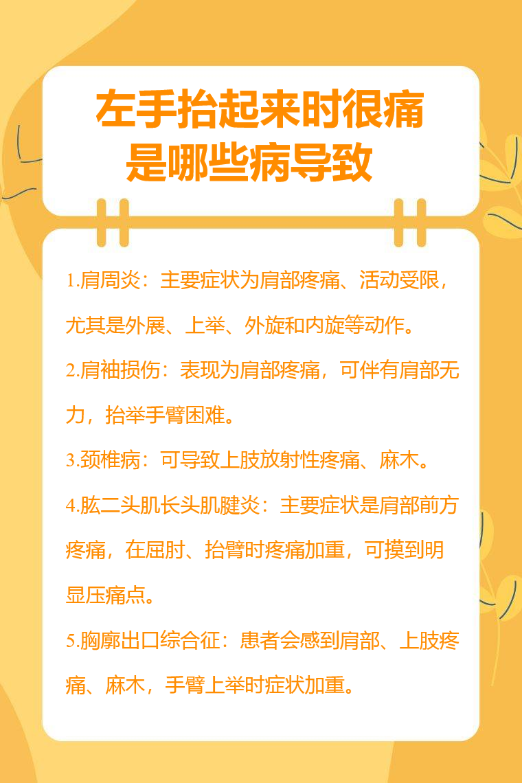 左手抬起來時很痛可能由肩周炎、肩袖損傷、頸椎病、肱二頭肌長頭肌腱炎、胸廓出口綜合徵等導致。