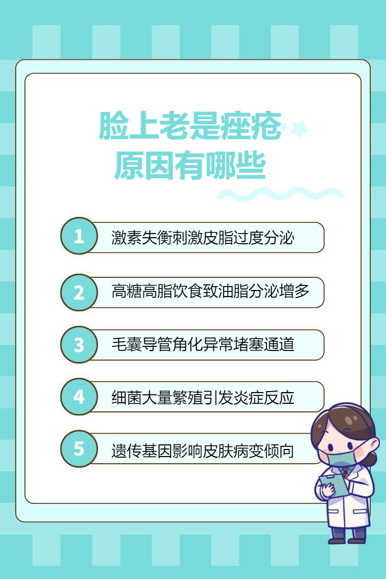 臉上老是長痤瘡的原因有內分泌失調、皮脂腺分泌旺盛、毛囊皮脂腺導管角化異常、痤瘡丙酸桿菌繁殖、遺傳因素等。