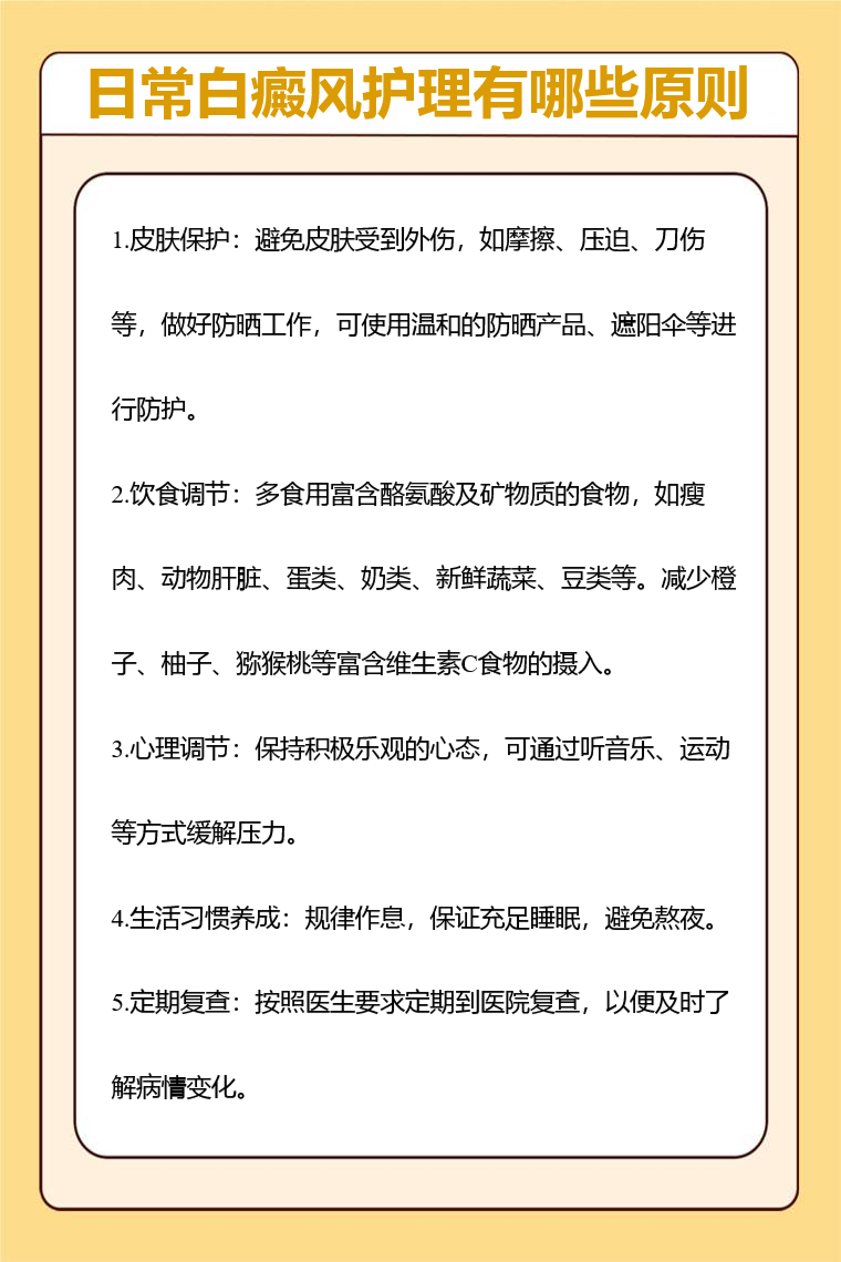 白癜風日常護理原則包括皮膚保護、飲食調節、心理調節、生活習慣養成、定期復查等。