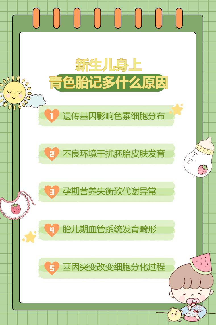 新生兒身上青色胎記多的原因包括遺傳因素、孕期環境因素、營養缺乏、血管發育異常、基因突變等。