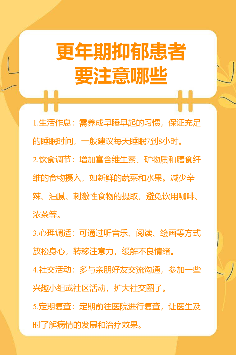 更年期抑鬱患者要注意生活作息、飲食調節、心理調適、社交活動、定期復查等。