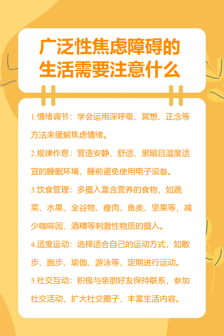 廣泛性焦慮障礙的生活需要注意情緒調節、規律作息、飲食管理、適度運動、社交互動等。
