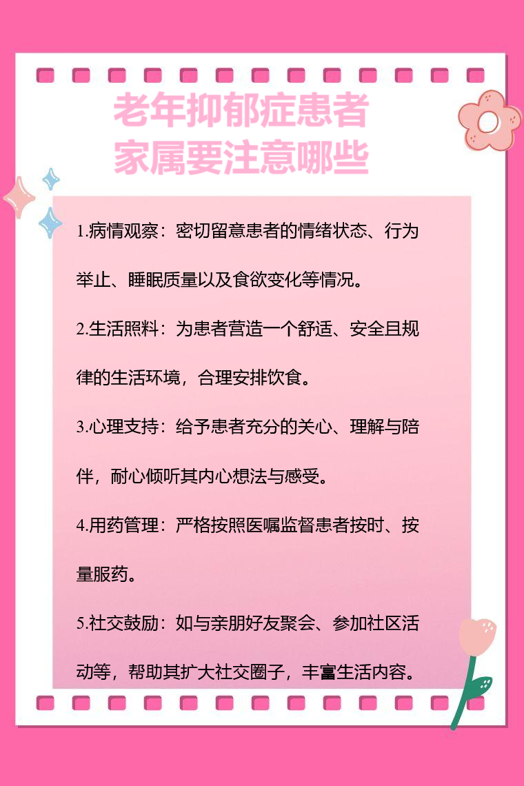老年抑鬱症患者家屬要注意病情觀察、生活照料、心理支持、用藥管理、社交鼓勵等。