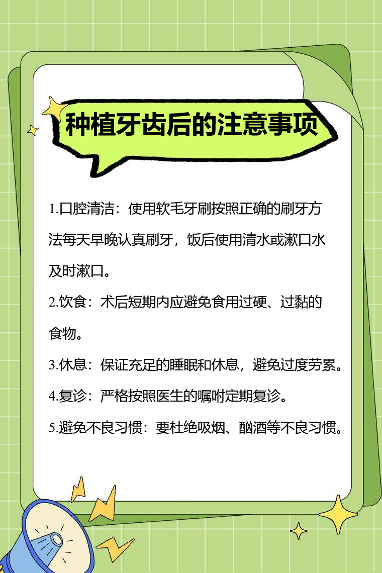 種植牙齒後需注意口腔清潔、飲食、休息、復診、避免不良習慣等。