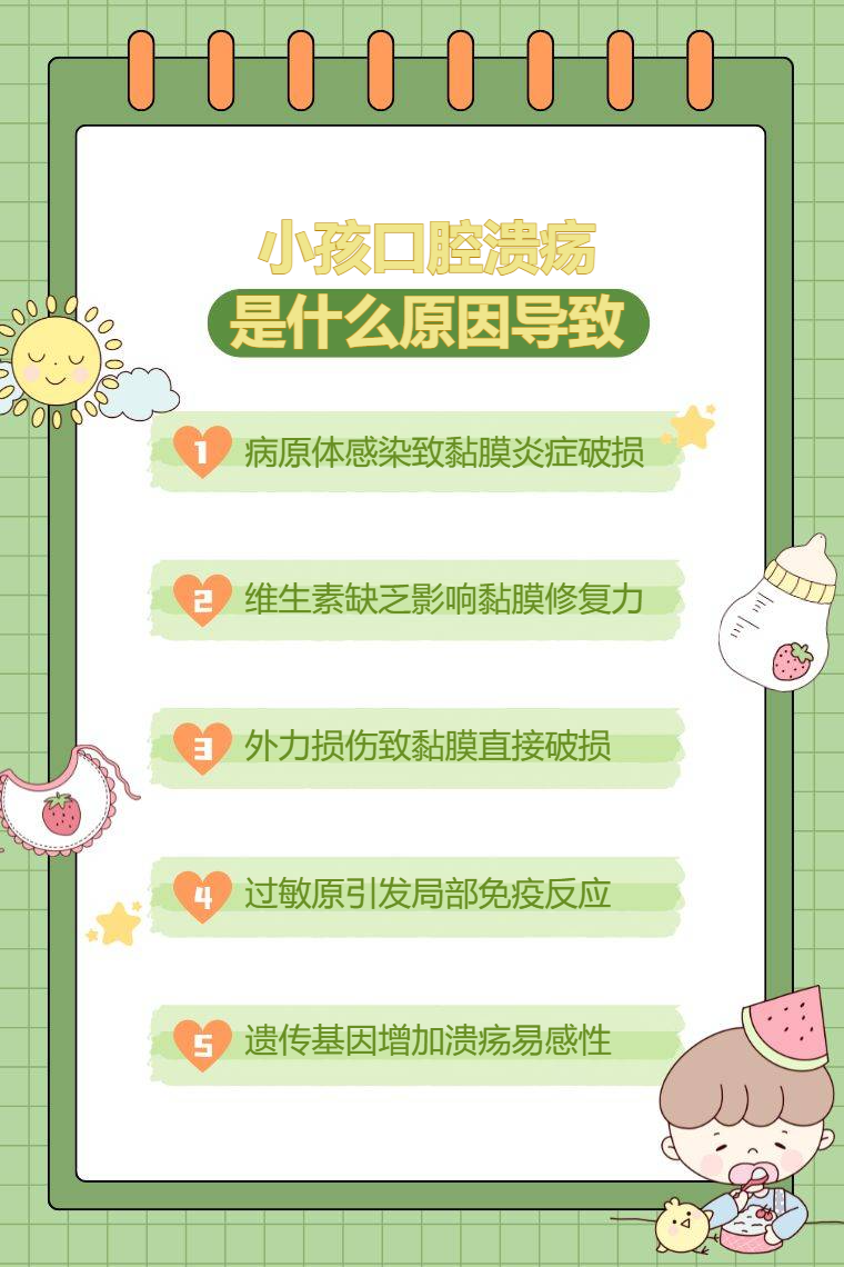 小孩口腔潰瘍通常由感染、缺乏維生素、外傷、過敏、遺傳等導致。