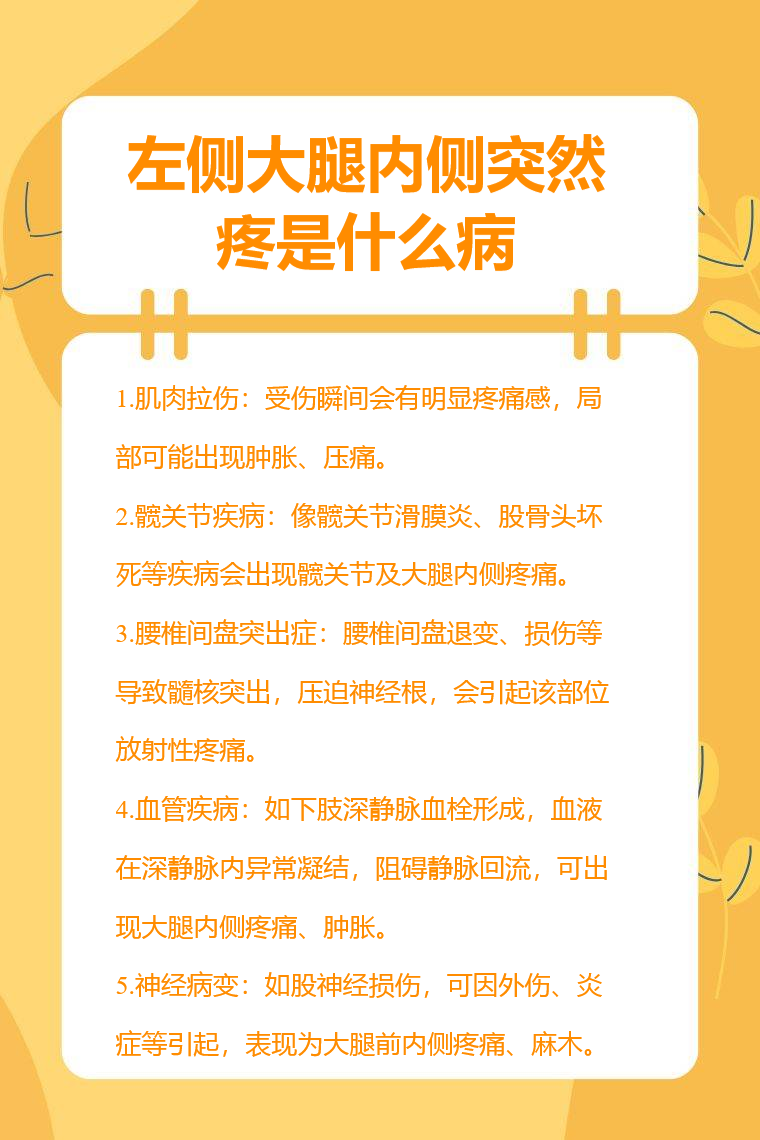 左側大腿內側突然疼可能由肌肉拉傷、髖關節疾病、腰椎間盤突出症、血管疾病、神經病變等引起。