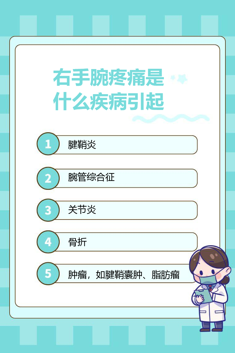 右手腕疼痛可能由腱鞘炎、腕管綜合徵、關節炎、骨折、腫瘤等引起。