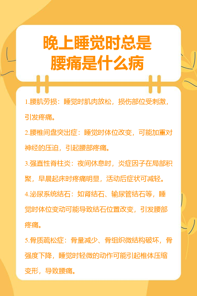 1.腰肌勞損:長期的腰部肌肉勞累、姿勢不良等,致使腰部肌肉慢性損傷,睡覺時肌肉放鬆,損傷部位受刺激,引發疼痛。疼痛多為酸痛,在勞累後加重,休息後緩解。