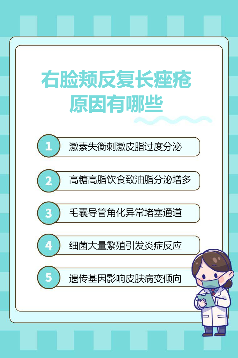 右臉頰反復長痤瘡的原因有內分泌失調、皮脂腺分泌旺盛、毛囊皮脂腺導管角化異常、微生物感染、遺傳因素等。