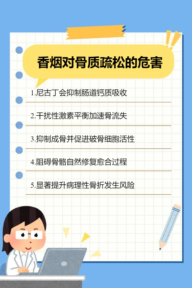 香煙對骨質酥鬆的危害包括影響鈣吸收、干擾激素水平、降低骨密度、阻礙骨修復、增加骨折風險等。