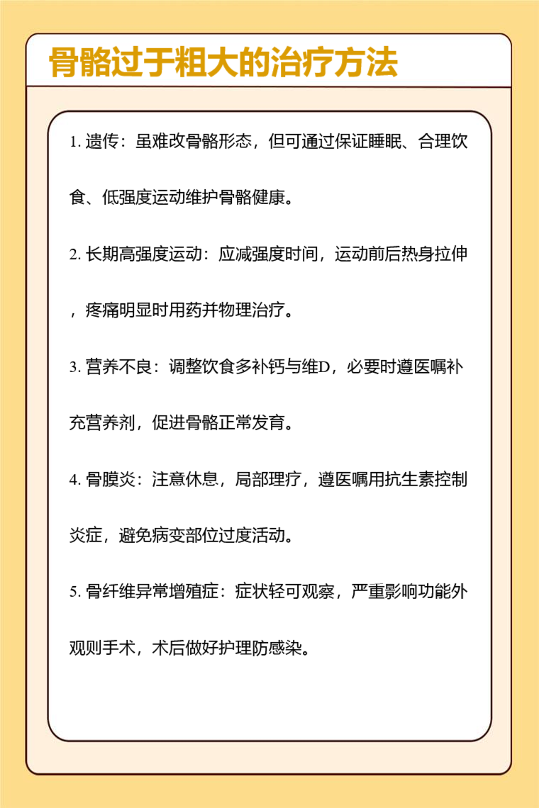 骨骼過於粗大可能是遺傳、長期高強度運動、營養不良、骨膜炎、骨纖維異常增殖症等因素,需要針對病因治療,可採取的方法有生活調整、藥物治療、手術治療等。