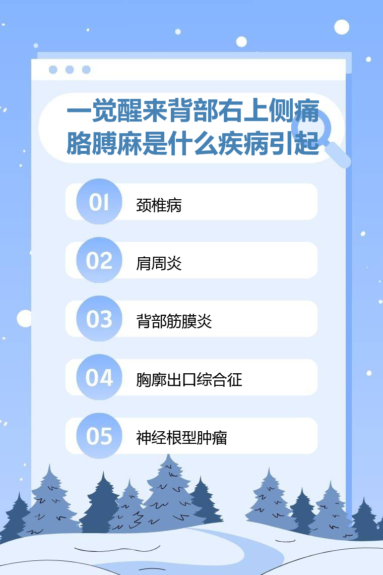 一覺醒來背部右上側痛胳膊麻可能由頸椎病、肩周炎、背部筋膜炎、胸廓出口綜合徵、神經根型腫瘤等引起。
