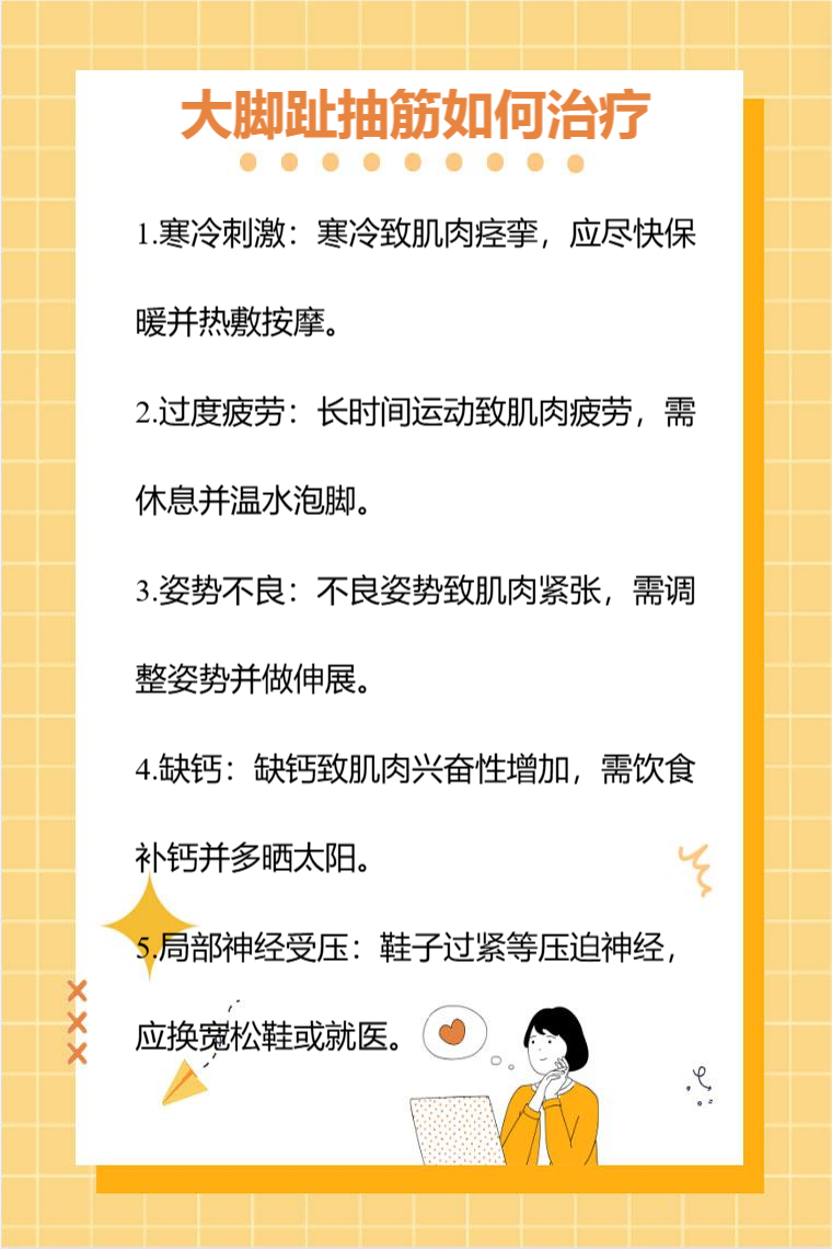 大腳趾抽筋可能是寒冷刺激、過度疲勞、姿勢不良、缺鈣、局部神經受壓等因素,需要針對病因治療,可採取的方法有保暖、休息、調整姿勢、補鈣、解除壓迫等。