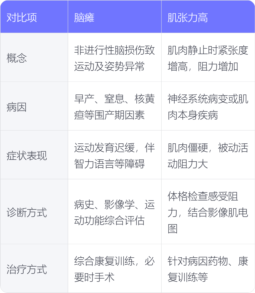 腦癱與肌張力高在概念、病因、症狀表現、診斷方式、治療方式上存在不同。