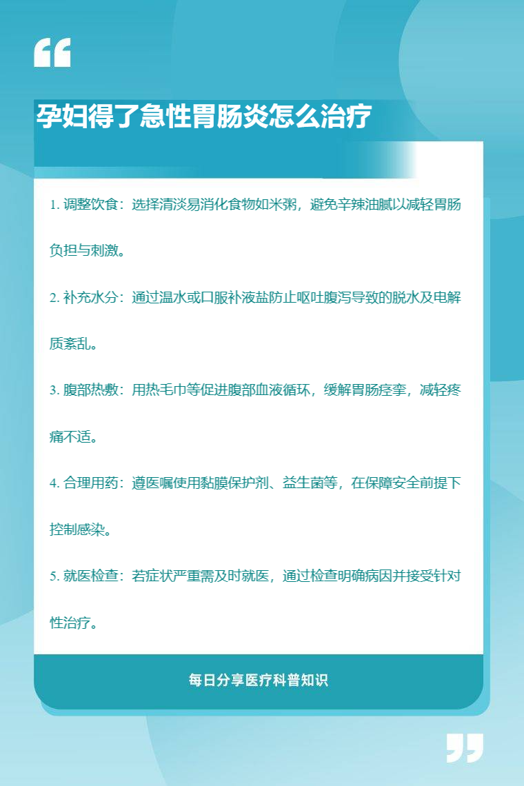 孕婦得了急性胃腸炎可通過調整飲食、補充水分、腹部熱敷、合理用藥、就醫檢查等方法治療。