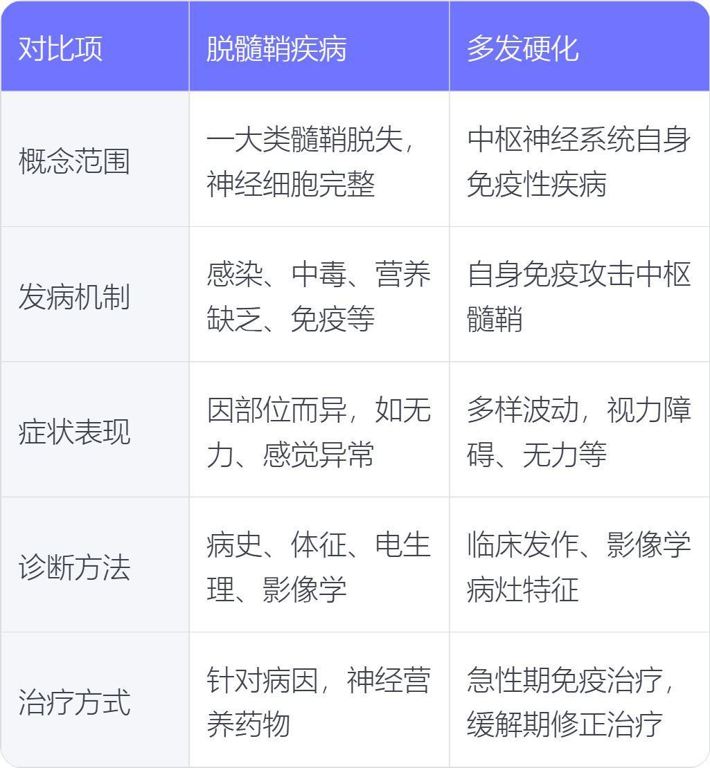 脫髓鞘疾病和多發硬化在概念範圍、發病機制、症狀表現、診斷方法、治療方式上存在不同。