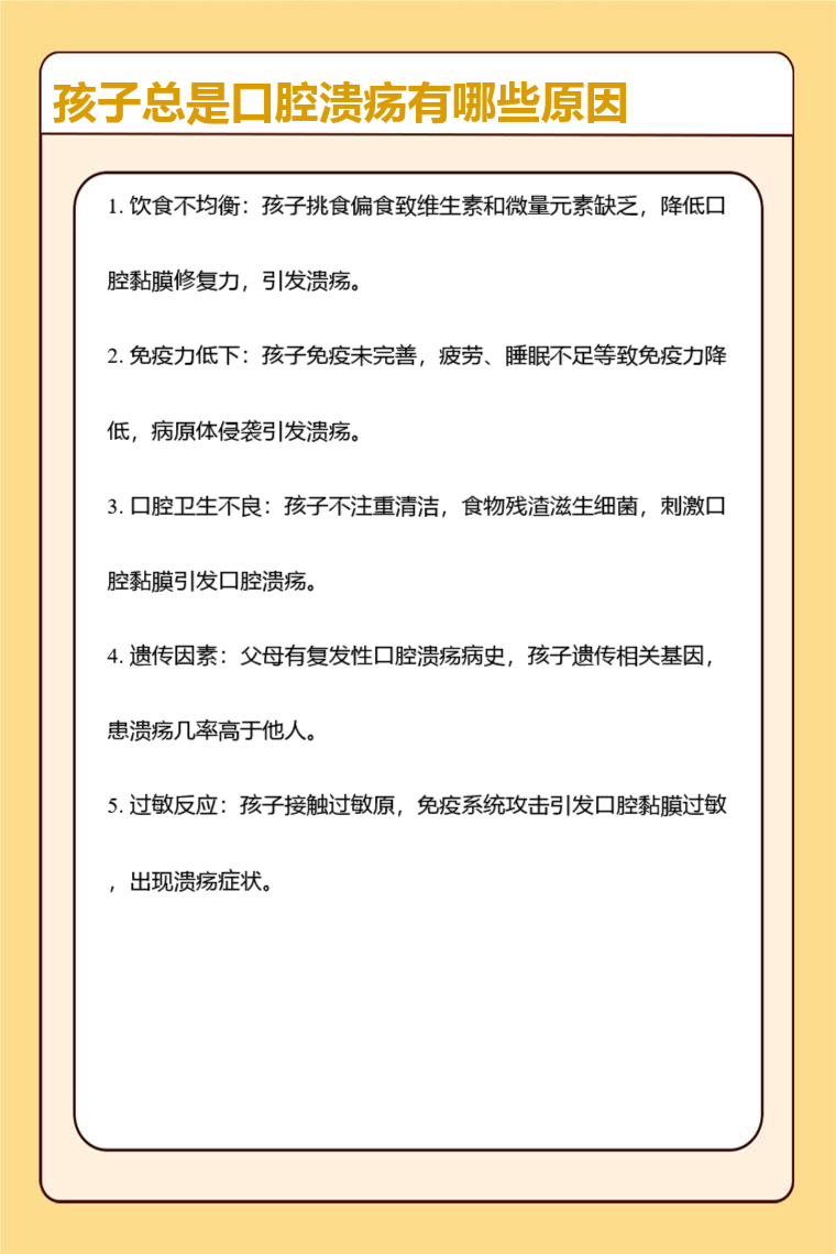 1. 飲食不均衡:孩子若挑食、偏食,不愛吃蔬菜、水果,易導致體內維生素如B族維生素、維生素C等和微量元素如鋅等缺乏,使得口腔黏膜的修復能力下降,從而容易引發口腔潰瘍。