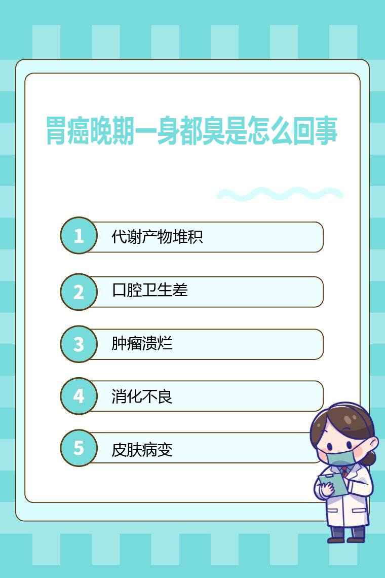 胃癌晚期一身都臭可能是由於代謝產物堆積、口腔衛生差、腫瘤潰爛、消化不良、皮膚病變等。
