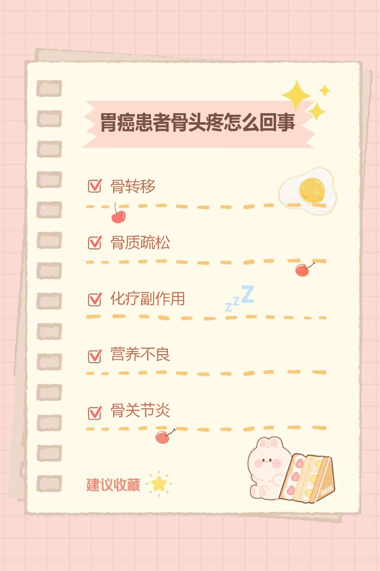 胃癌患者骨頭疼可能是由於骨轉移、骨質酥鬆、化療副作用、營養不良、骨關節炎等。