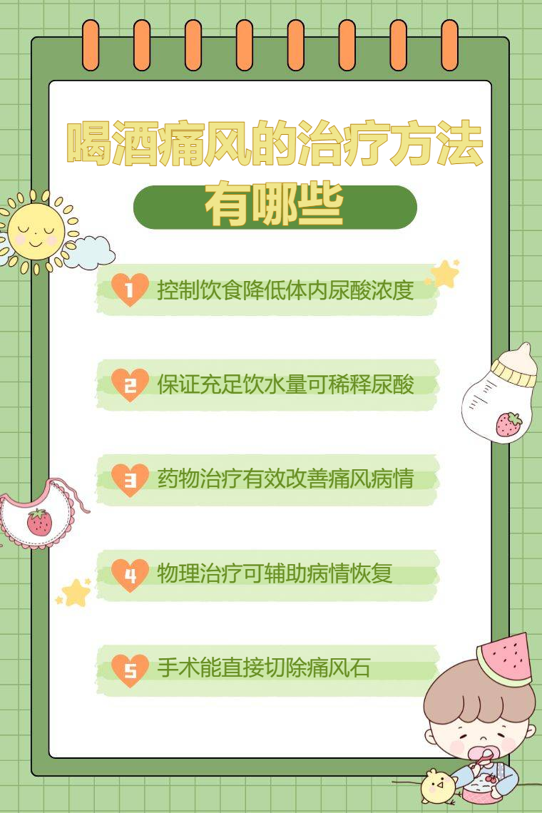 喝酒痛風的治療方法有控制飲食、大量飲水、藥物治療、物理治療、手術治療等。