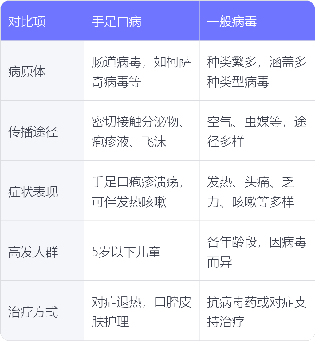手足口病與一般病毒在病原體、傳播途徑、症狀表現、高發人群、治療方式上存在不同。