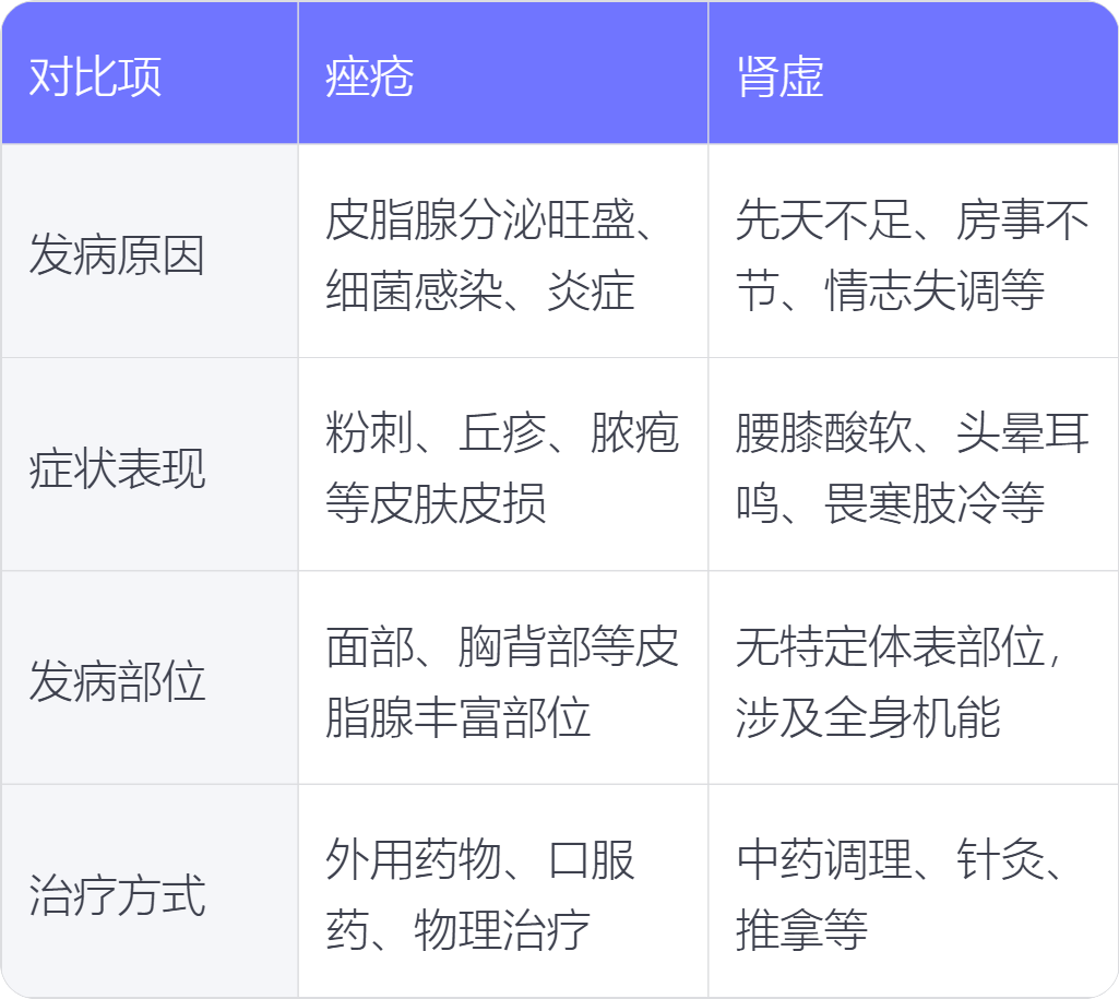 3. 發病部位:痤瘡好發於面部、胸背部等皮脂腺豐富的部位;腎虛主要是身體整體機能出現問題,涉及腎臟及相關臟腑經絡,無特定體表發病部位。