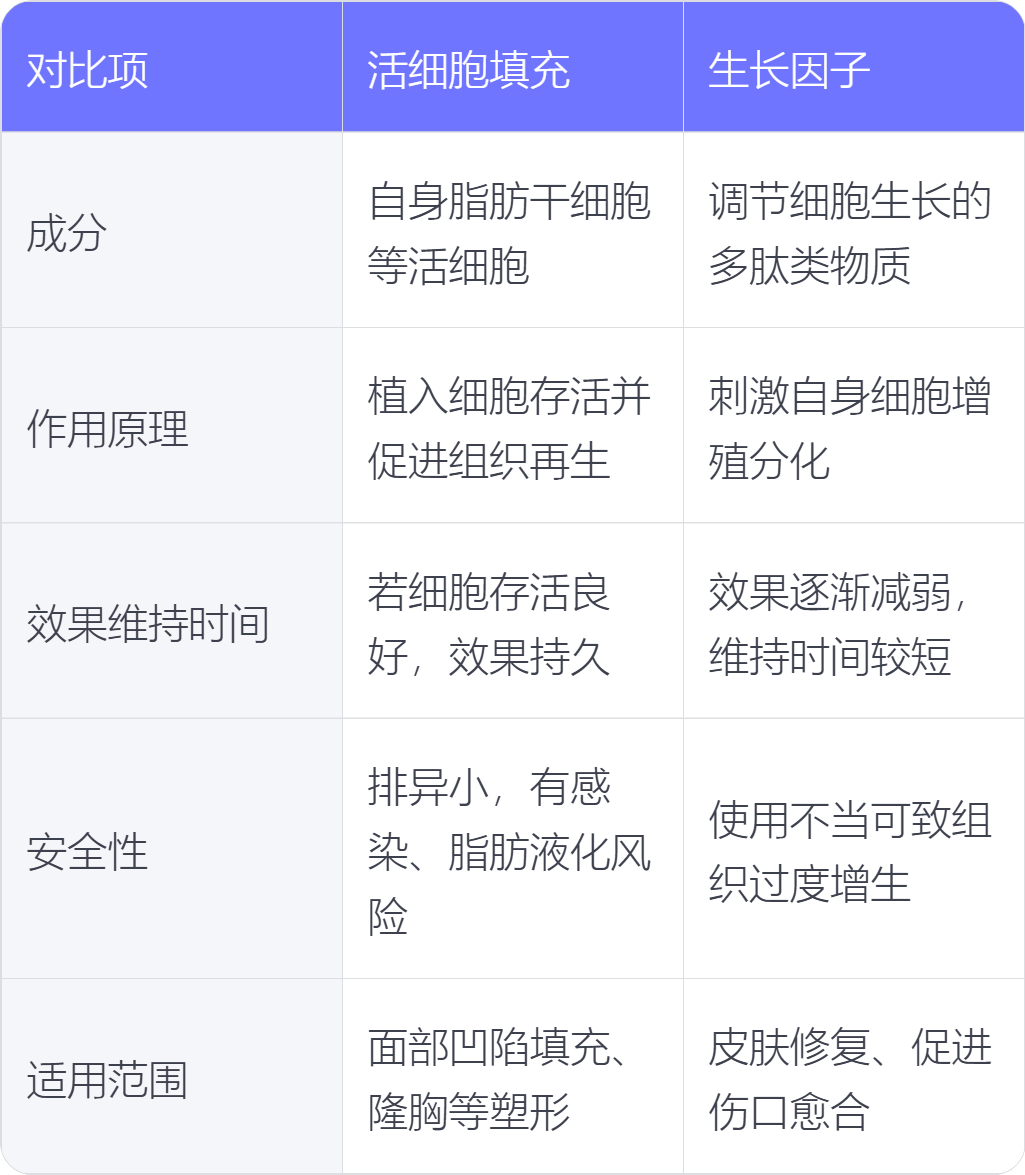活細胞填充和生長因子在成分、作用原理、效果維持時間、安全性、適用範圍上存在不同。