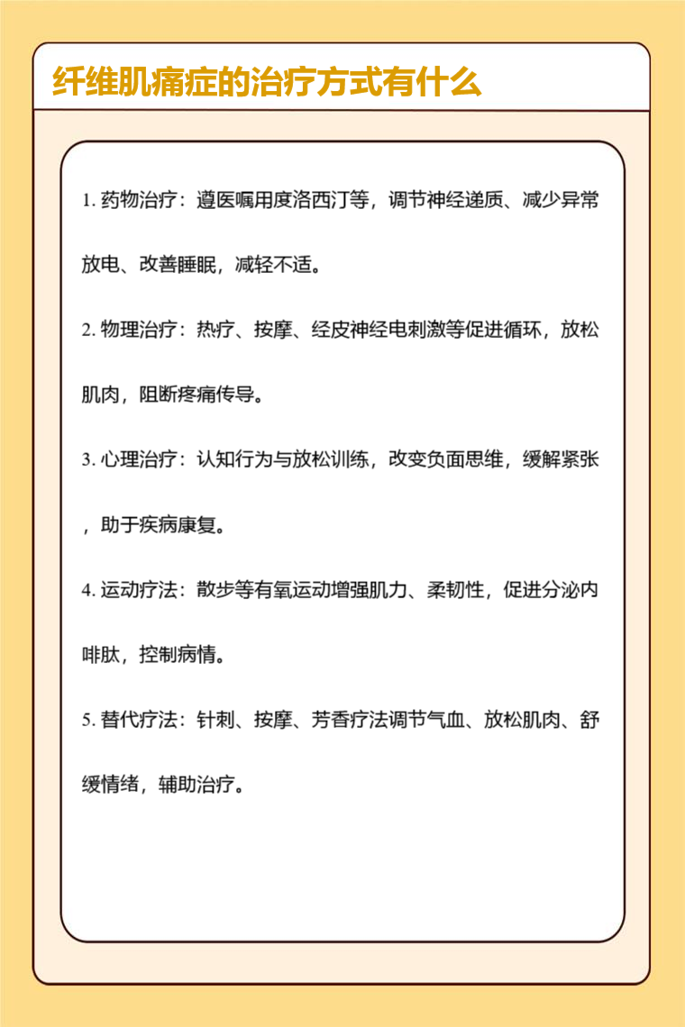 纖維肌痛症的治療方式有藥物治療、物理治療、心理治療、運動療法、替代療法等。