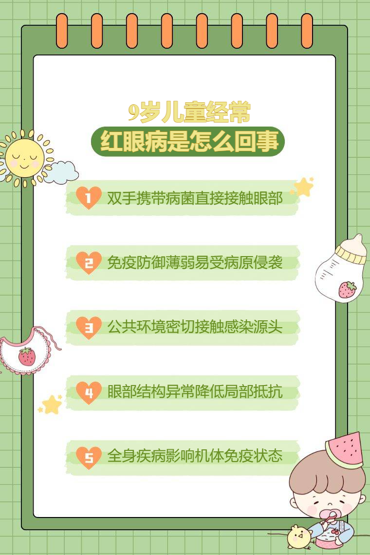 9歲兒童經常患紅眼病,常見原因有個人衛生習慣差、免疫力低下、接觸感染源、眼部局部因素、特殊疾病等。