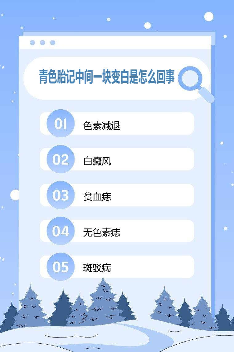 青色胎記中間一塊變白可能是由於色素減退、白癜風、貧血痣、無色素痣、斑駁病等。