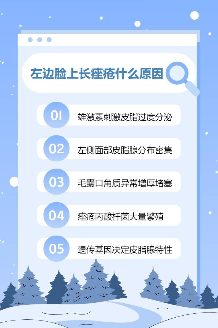 左邊臉上長痤瘡的原因有內分泌失調、皮脂腺分泌旺盛、毛囊口角化異常、微生物感染、遺傳因素等。