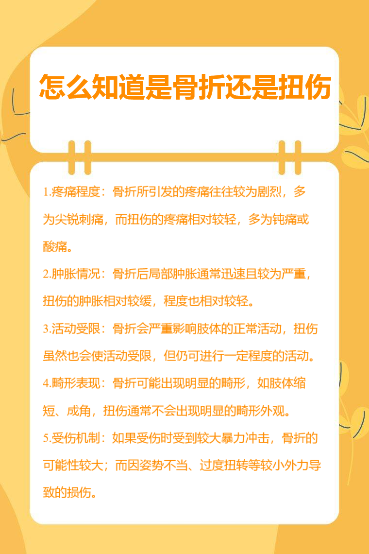 5.受傷機制:如果受傷時受到較大暴力衝擊,如高處墜落、重物撞擊等,骨折的可能性較大;而因姿勢不當、過度扭轉等較小外力導致的損傷,扭傷更為常見。