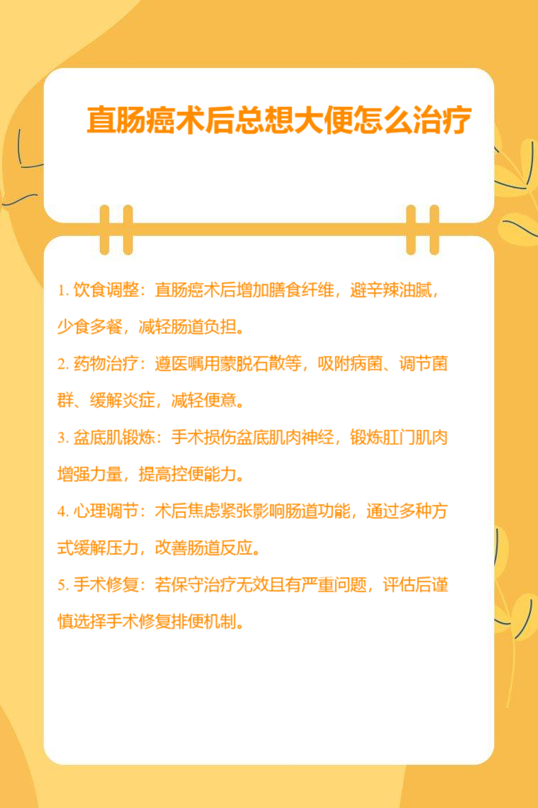 直腸癌術後總想大便可通過飲食調整、藥物治療、盆底肌鍛鍊、心理調節、手術修復等方法治療。