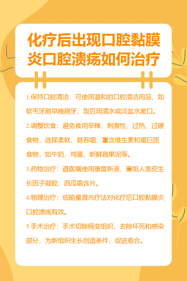 化療後出現口腔黏膜炎口腔潰瘍可通過保持口腔清潔、調整飲食、藥物治療、物理治療、手術治療等方法應對。
