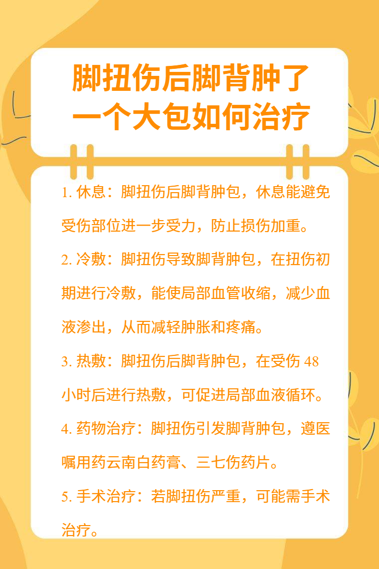 腳扭傷後腳背腫了一個大包可通過休息、冷敷、熱敷、藥物治療、手術治療等方法處理。