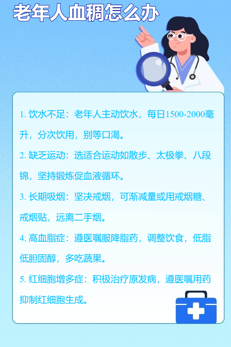 老年人血稠可能是飲水不足、缺乏運動、長期吸煙、高血脂症、紅細胞增多症等因素,需要針對病因治療,可採取的方法有增加飲水、適度運動、戒煙、藥物降脂、治療原發病等。
