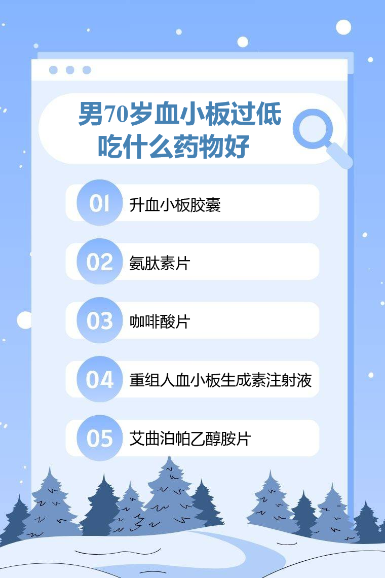 70歲男性血小板過低可以服用的藥物有升血小板膠囊、氨肽素片、咖啡酸片、重組人血小板生成素注射液、艾曲泊帕乙醇胺片等藥物好。血小板過低的用藥需嚴格遵醫囑,不可自行隨意增減藥量或停藥。