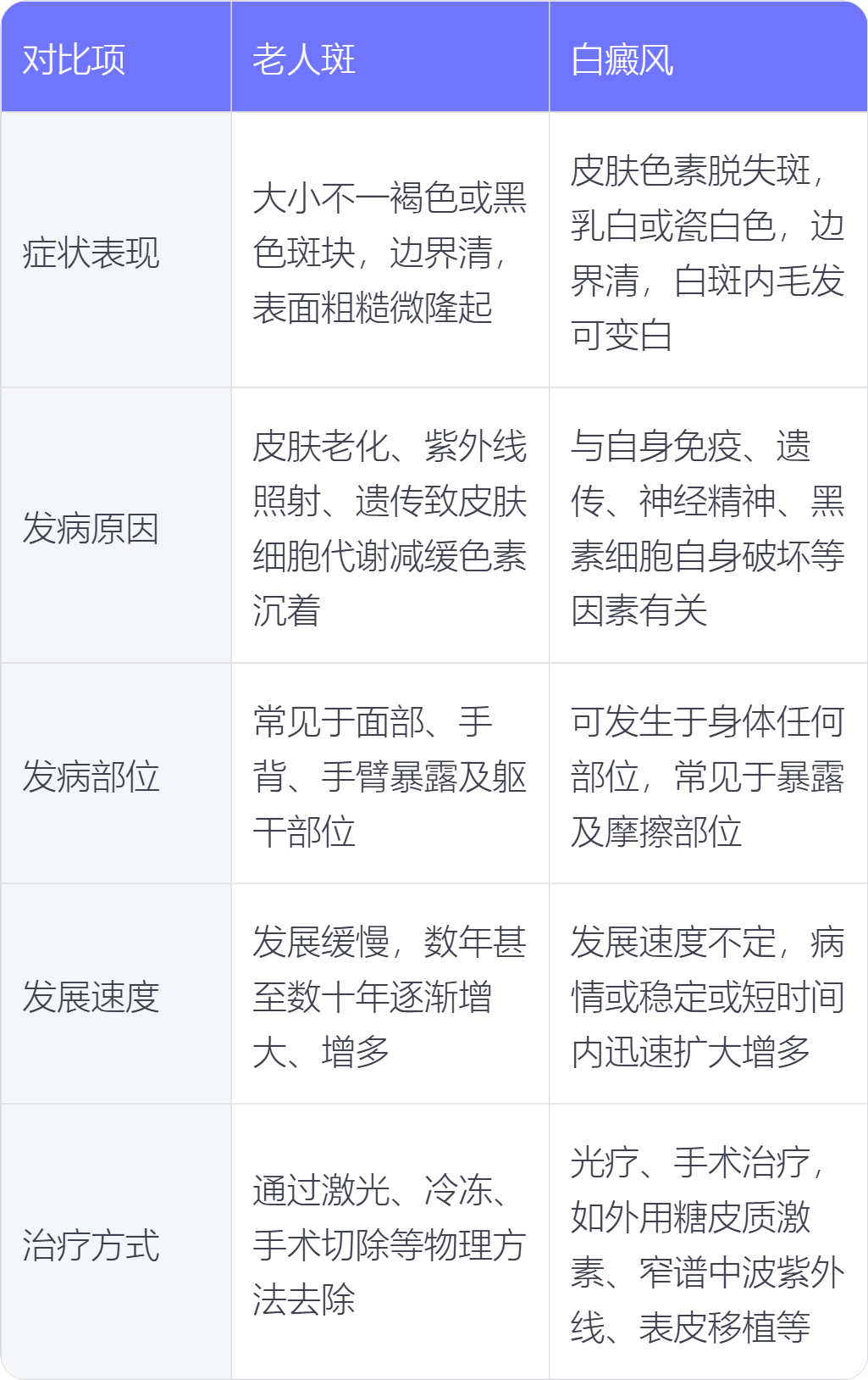 老人斑和白癜風可從症狀表現、發病原因、發病部位、發展速度、治療方式來區別。