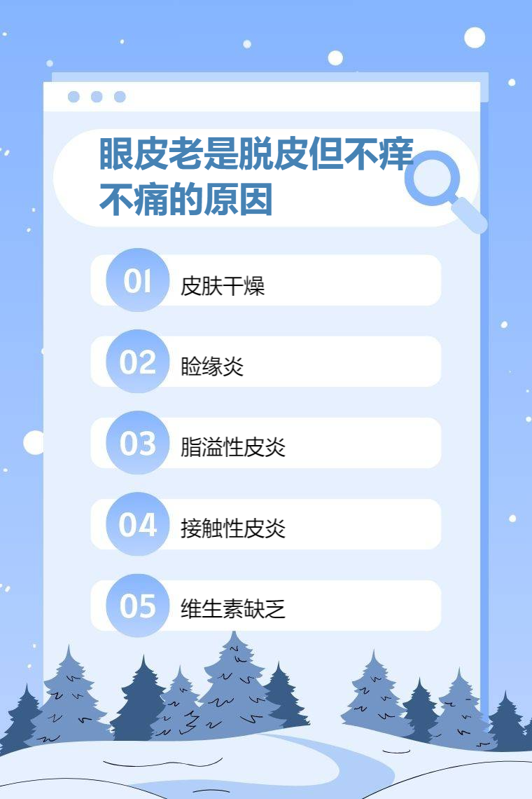 眼皮老是脫皮但不癢不痛可能是由於皮膚乾燥、瞼緣炎、脂溢性皮炎、接觸性皮炎、維生素缺乏等。