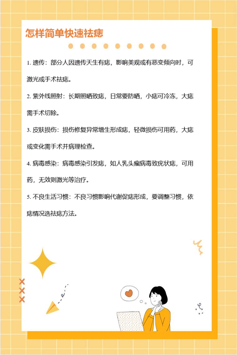 祛痣可能是遺傳、紫外線照射、皮膚損傷、病毒感染、不良生活習慣等因素,需要針對病因治療,可採取的方法有激光祛痣、手術切除等。
