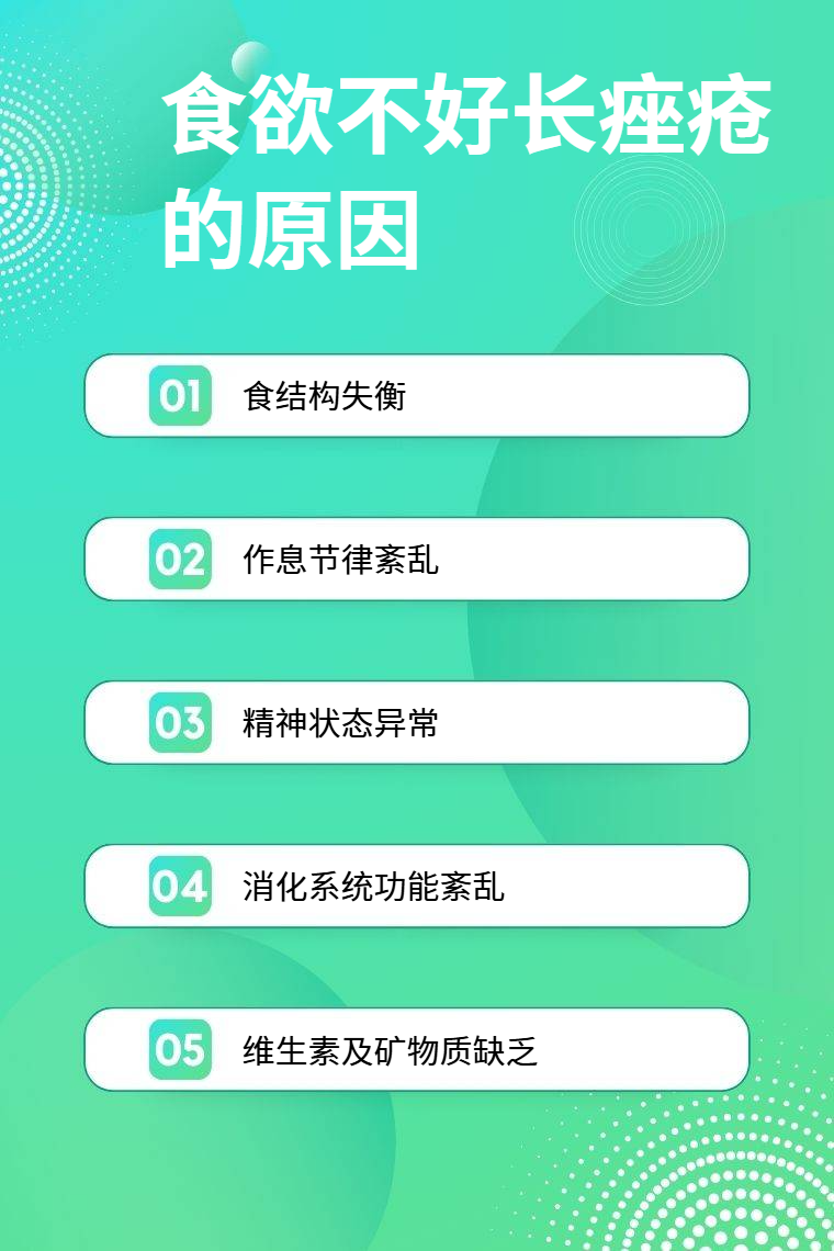 食慾不好且長痤瘡的原因包括飲食結構失衡、作息節律紊亂、精神狀態異常、消化系統功能紊亂、維生素及礦物質缺乏等,這些因素可通過影響身體代謝、胃腸功能及皮膚狀態,導致兩種症狀同時出現。
