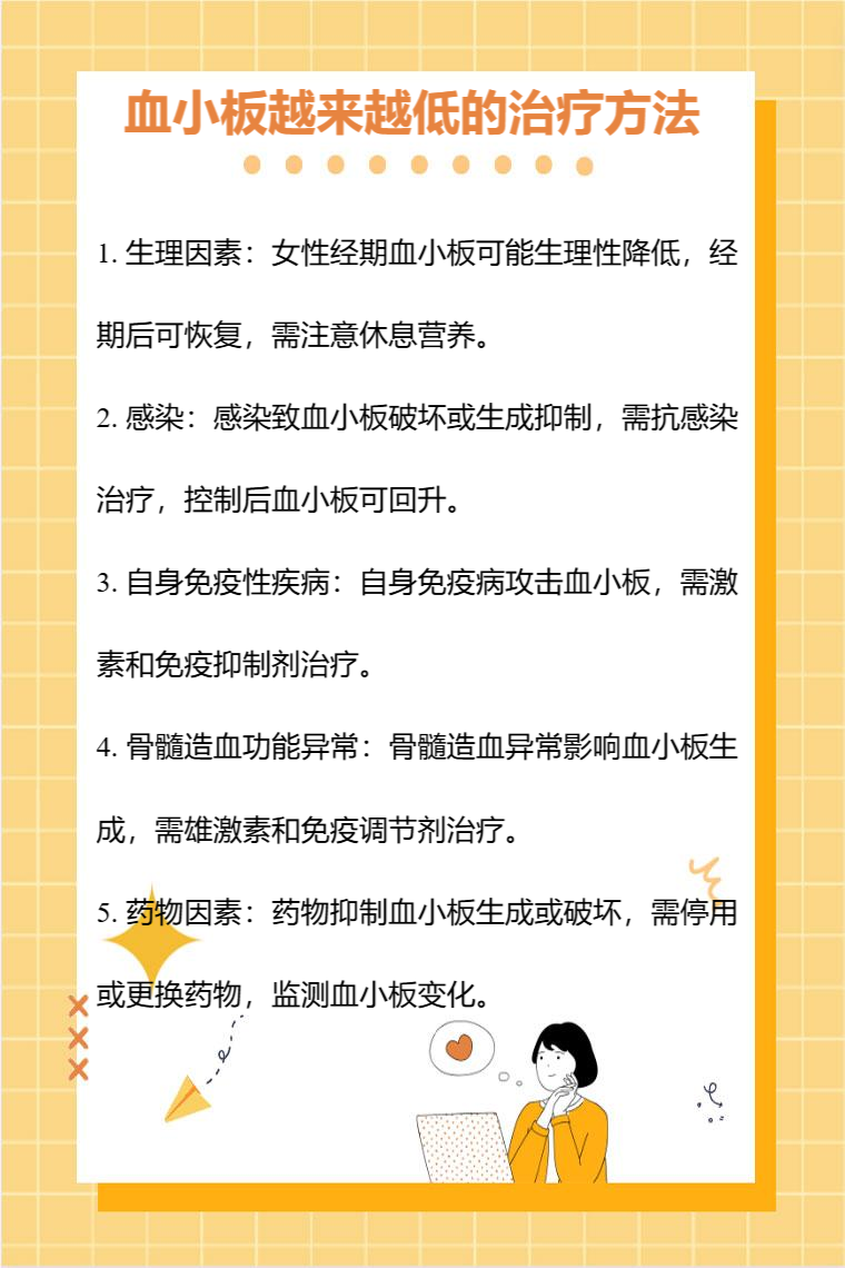 血小板越來越低可能是生理因素、感染、自身免疫性疾病、骨髓造血功能異常、藥物因素等,需要針對病因治療,可採取的方法有調整生活方式、抗感染、免疫抑制治療、促進造血、調整用藥等。
