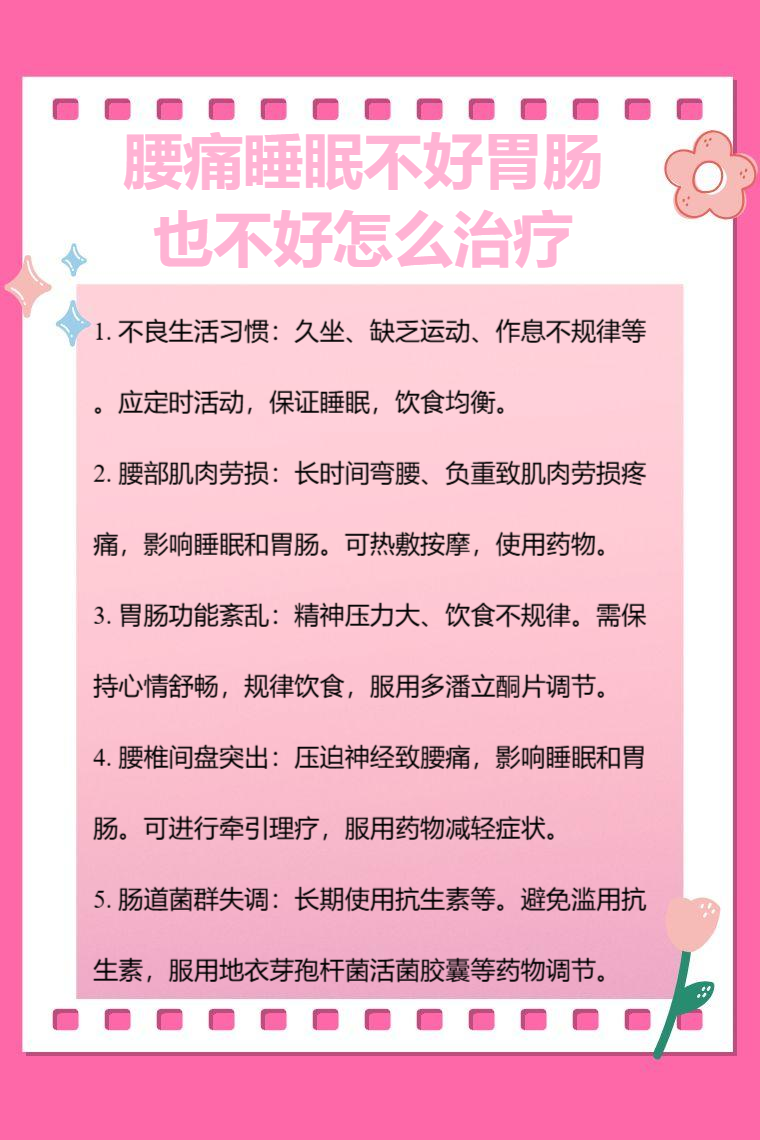 腰痛、睡眠不好、胃腸也不好可能是不良生活習慣、腰部肌肉勞損、胃腸功能紊亂、腰椎間盤突出、腸道菌群失調等因素,需要針對病因治療,可採取的方法有改善生活方式、物理治療、藥物治療等。
