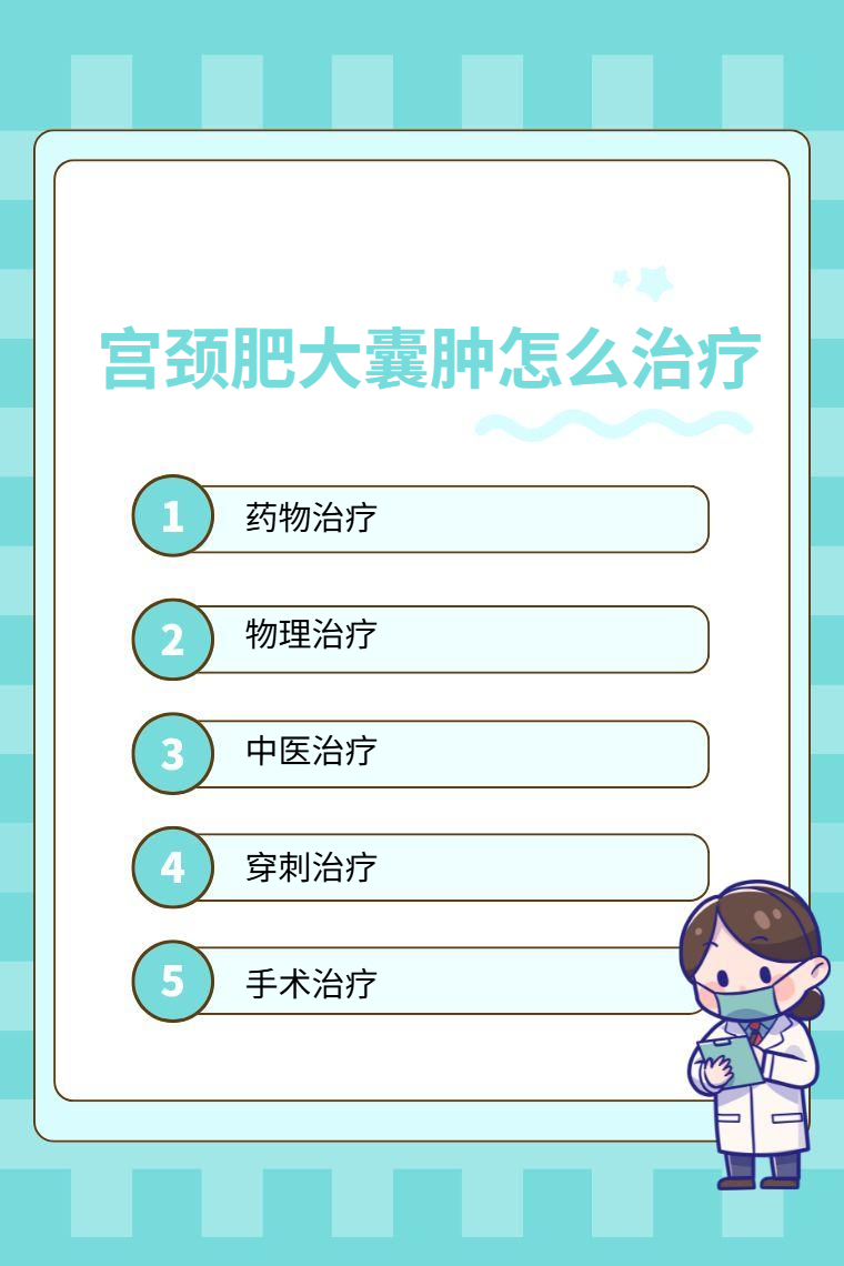宮頸肥大囊腫的治療方法包括藥物治療、物理治療、中醫治療、穿刺治療及手術治療等。