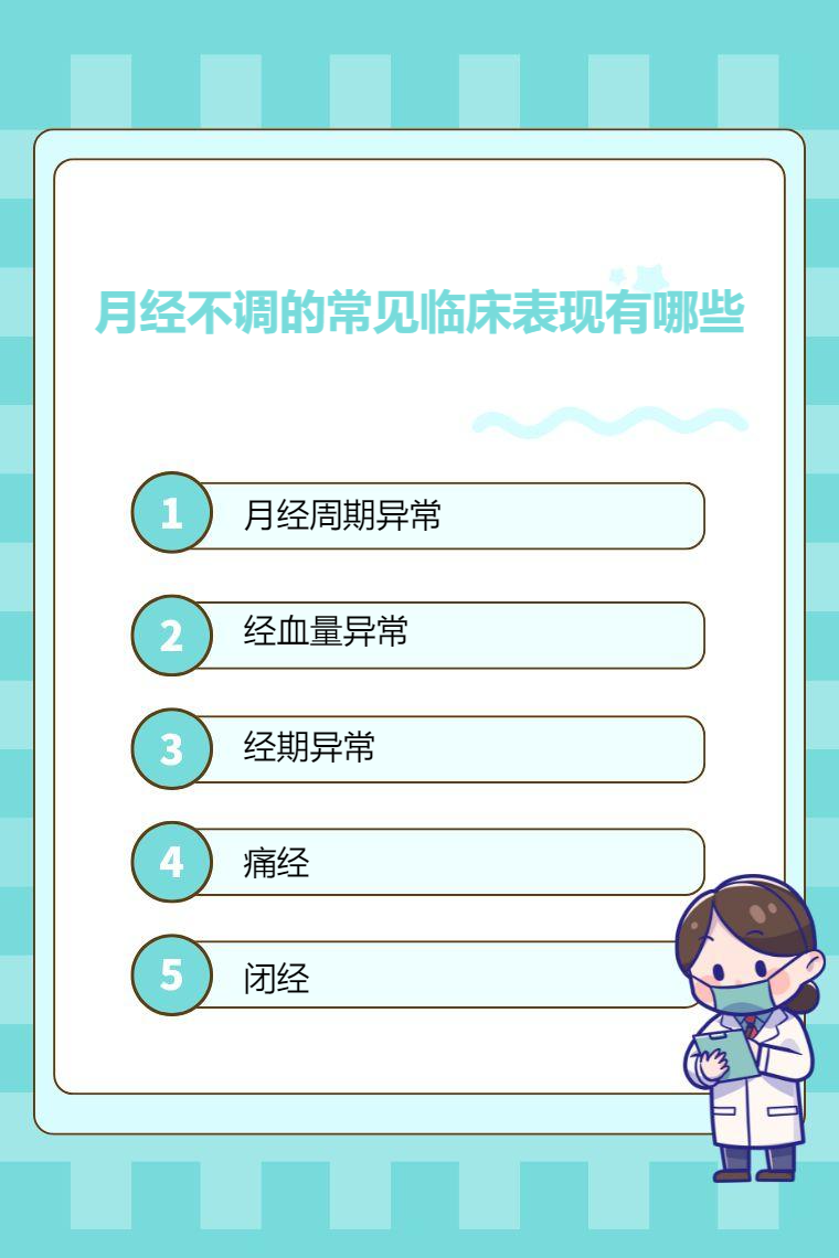 月經不調的臨床表現包括月經週期異常、經血量異常、經期異常、痛經、閉經等。