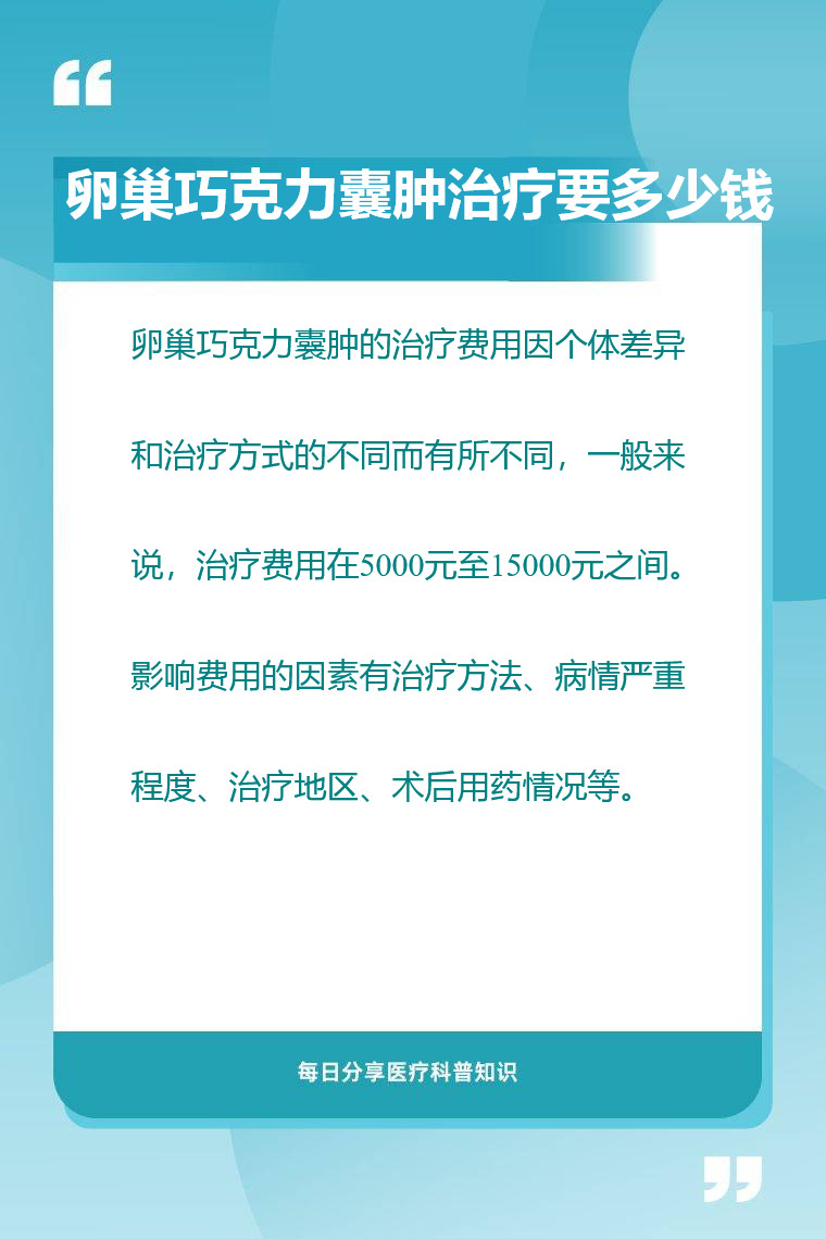 卵巢巧克力囊腫的治療費用因個體差異和治療方式的不同而有所不同,一般來說,治療費用在5000元至15000元之間。影響費用的因素有治療方法、病情嚴重程度、治療地區、術後用藥情況等。