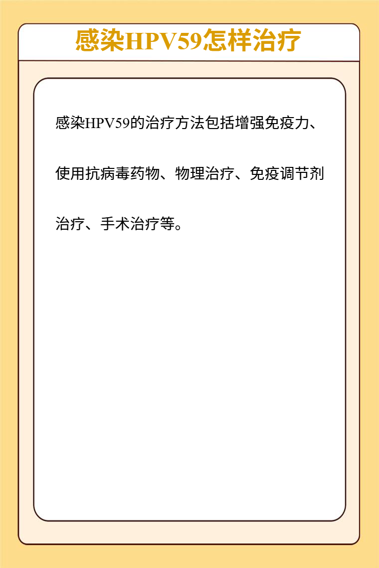 感染HPV59的治療方法包括增強免疫力、使用抗病毒藥物、物理治療、免疫調節劑治療、手術治療等。